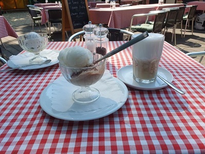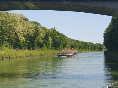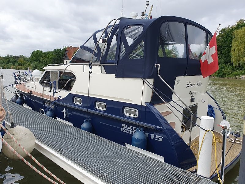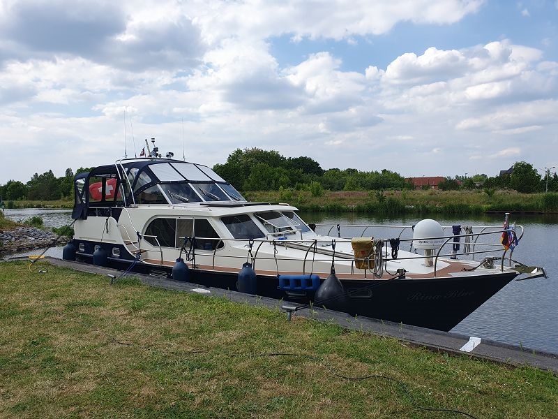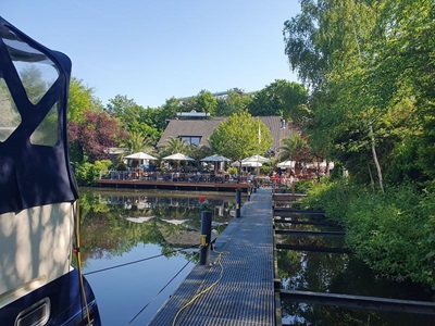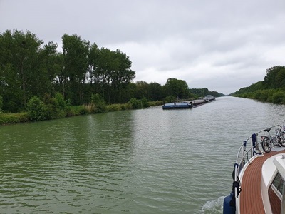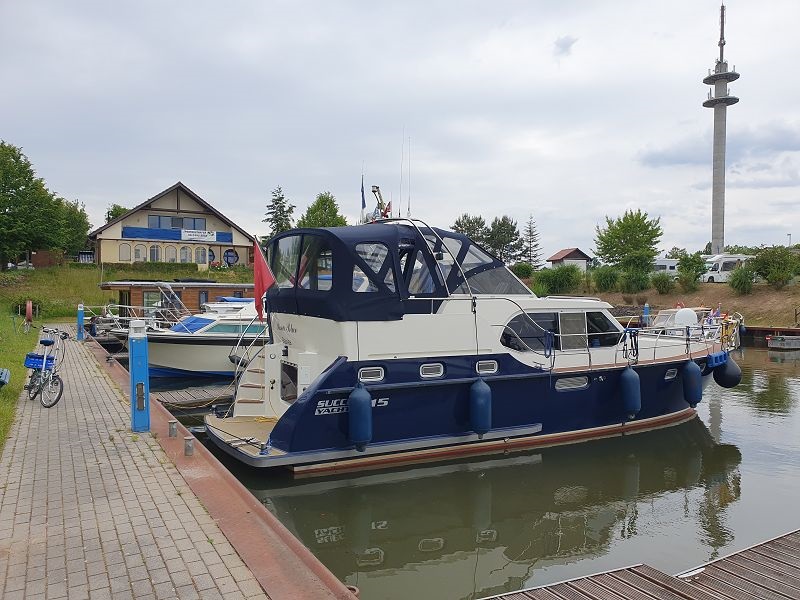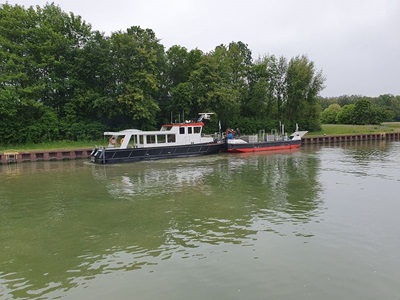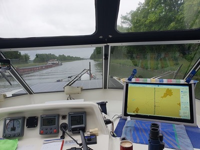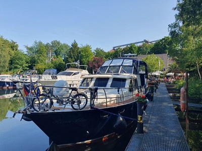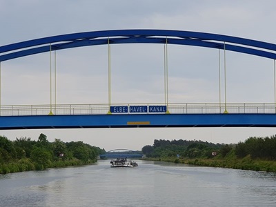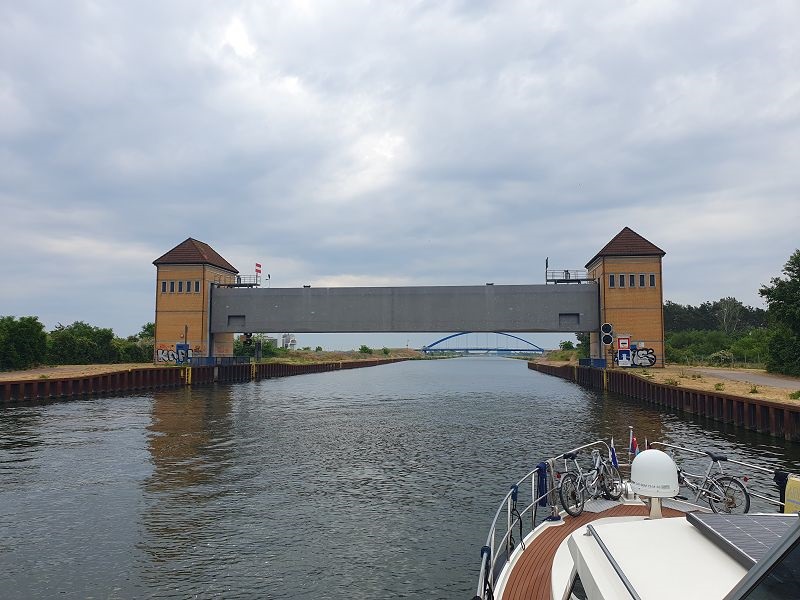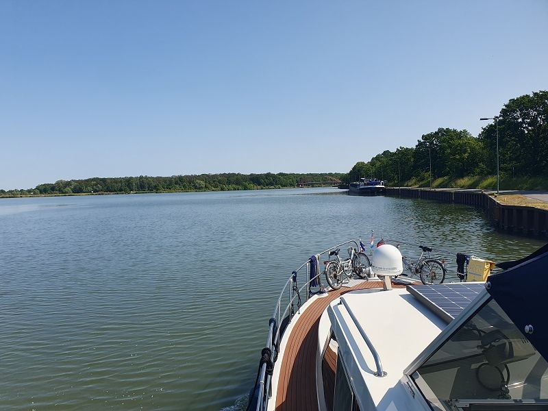 Gegen neun Uhr legen wir ab in Wolfsburg und fahren bei Sonnenschein weiter in Richtung Osten. Auch heute sind wieder viele Berufsschiffe unterwegs. Die Fahrt führt uns meistens durch unbesiedelte Landschaft, link und rechts am Kanal ist alles grün. Die entgegenkommenden Frachtschiffe bieten eine gute Abwechslung in der Fahrt auf dem Mittel Land Kanal. Gegen 14.00 Uh erreichen wir unser Tagesziel, Haldesleben. Der Hafen ist sehr gut belegt, es hat aber trotzdem noch Plätze für Gäste. Nach dem Anmelden beim Hafenmeister fahren wir mit den Velos noch ins Städtchen und erkunden die Fußgängerzone. In eine Eis Kaffee gibt es einen feinen Kaffee und natürlich auch einen Cup. Zum Nachtessen sind wir zurück auf der Rina Blue.