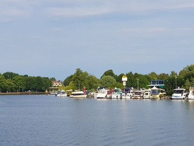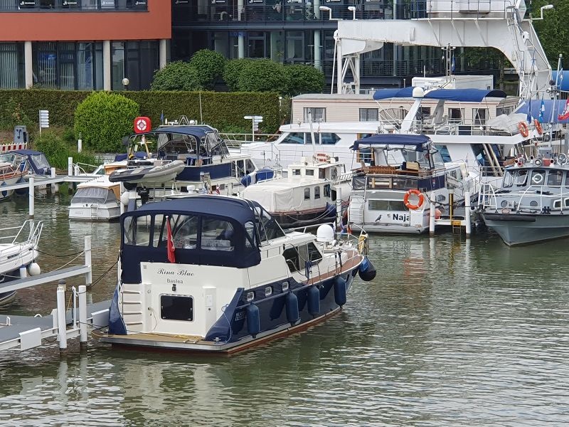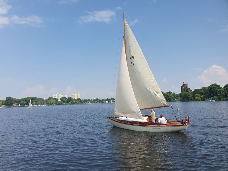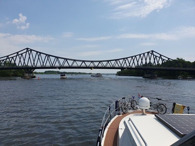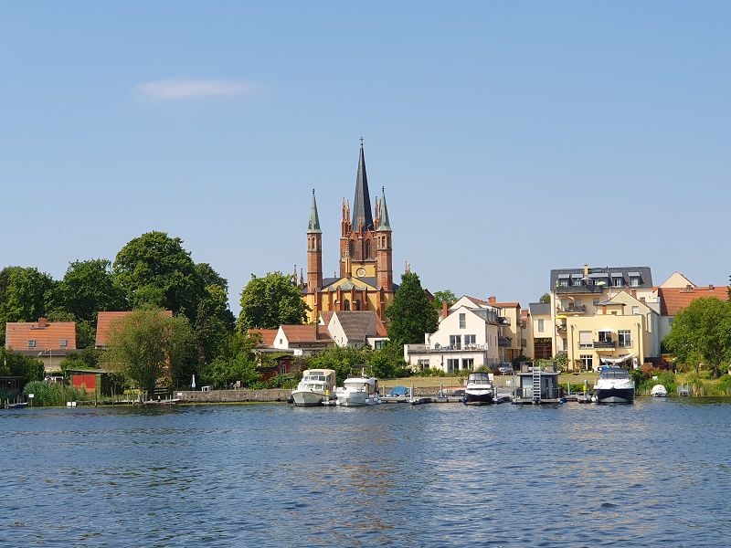 In Brandenburg haben wir eine ruhige Nacht verbracht, bis am Morgen um sechs Uhr der erste Frachter vorbei gefahren ist. Wir wollen aber auch zeitig losfahren, so dass wir früh am heutigen Tagesziel eintreffen. Telefonisch haben wir uns angemeldet, so sollte für uns ein Liegeplatz im Yachthafen Potsdam zur Verfügung stehen. Wir genießen die Fahrt, sind wir anfänglich doch fast alleine unterwegs. Einige Frachter kommen uns entgegen, offenbar auch Frühaufsteher ;-). Bei Kezin biegen wir über Steuerbord ab und fahren via Potsdamern Havel, vorbei an Werder weiter. Im Schwilowsee geht es durch den schmalen Kanal "Caputher Gmünde" zum Templiner See und erreich bald den Yachthafen Potsdam. Hier liegen wir, wie vor vier Jahren am Außensteg und genießen den kühlenden Wind der von Nordosten weht.