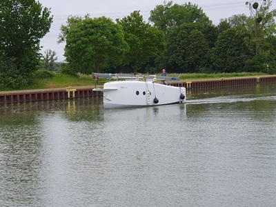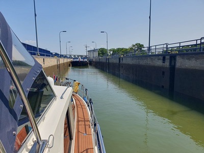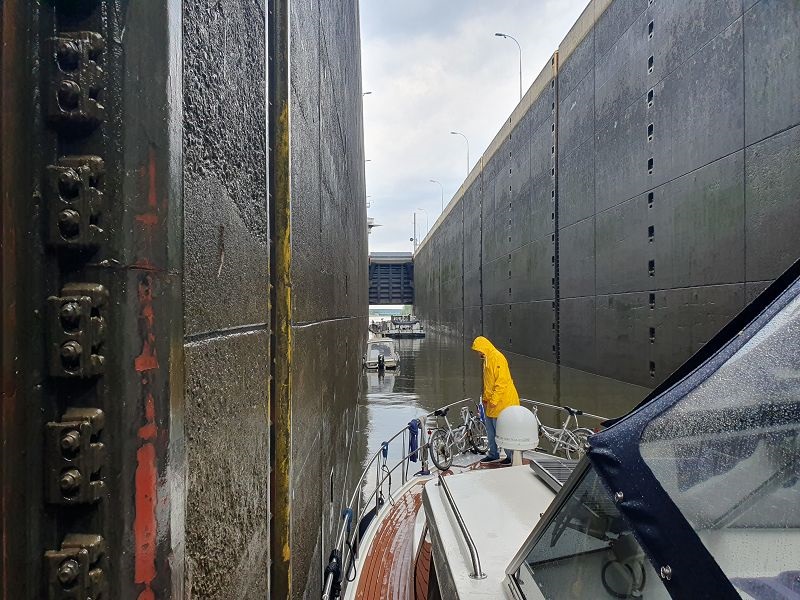 Wir haben eine sehr ruhige Nacht in der Marina Heidanger verbracht. Nach dem Frühstück fahren wir weiter, zurück zum MLK und biegen dann über Steuerbord ab in Richtung Osten. Es ist schon viel Betrieb auf dem Kanal und in den anliegenden Häfen. Kurz nach der Verzweigung zum Elbe Seiten Kanal kommt die Schleuse Sülfeld. Hier müssen wir warten, bis ein Frachter in die gleiche Richtung fahren will wie wir. Nach 40 Minuten können wir hinter einem Frachter in die Schleuse fahren. Diese hat Schwimmpoller, was uns das Schleusen sehr erleichtert. Mit einer Leine Festgemacht geht es abwärts in mehreren Schritten. Die Schleuse Sülfeld ist eine Sparschleuse, das heißt, dass das abgelassene Wasser in verschiedenen Becken aufgefangen wird und dadurch nur wenig Wasser bei der Schleusung wirklich verbraucht wird. Schon bald erreichen wir den Motorboot Club Wolfsburg, wo wir für eine Nacht festmachen.