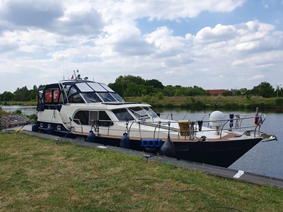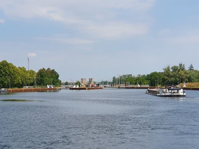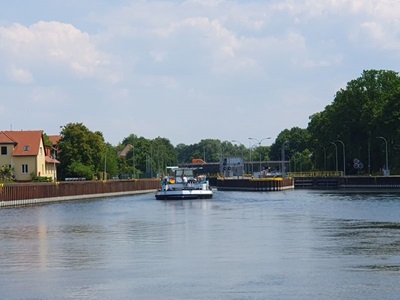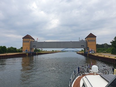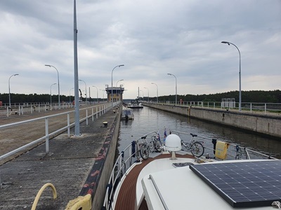 Wir fahren heute zeitig los, so dass wir nicht zu spät am Zielort an kommen. Der Himmel ist bedeckt und es ist ach ein kurzer Regenschauer angesagt. Wir kommen gut voran und erreichen die Schleuse Hohenwarte bereits kurz nach 10 Uhr. Wir können auch gleich nach einem Frachter und zusammen mit einem anderen Sportboot in die Schleuse einfahren. Hier geht es 19.5 Meter nach unten. Nun passen wir unsere Geschwindigkeit der des Frachters vor uns an. Damit können wir auch die zweite Schleuse, Zerben mit dem Frachter zusammen durchfahren. Nun sind noch ca. 17 Kilometer vor uns, bis wir um kurz nach drei Uhr in Genthin ankommen. Mit den Velos fahren wir zum nahe gelegenen Supermarkt um den Vorrat von frischen Früchten zu ergänzen. Die Stadt bietet ansonsten nichts sehenswertes, also fahren wir nach einem Besuch in der Eisdiele zurück zum Schiff.